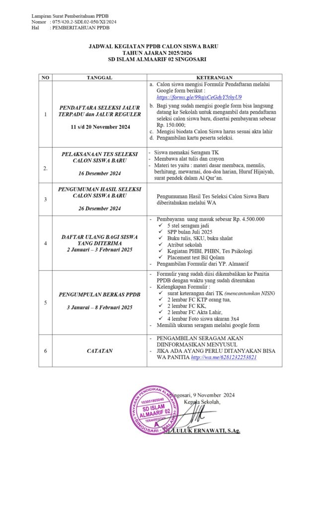 Sehubungan Penerimaan Peserta Didik Baru (PPDB) SD Islam Almaarif 02 Singosari Tahun Pelajaran 2025/2026, dengan ini Kami sampaikan informasi mengenai pelaksanaan Penerimaan Peserta Didik Baru (PPDB) bagi lulusan TK/RA Tahun Pelajaran 2024/2025. Berikut kami beritahukan sebagai berikut :