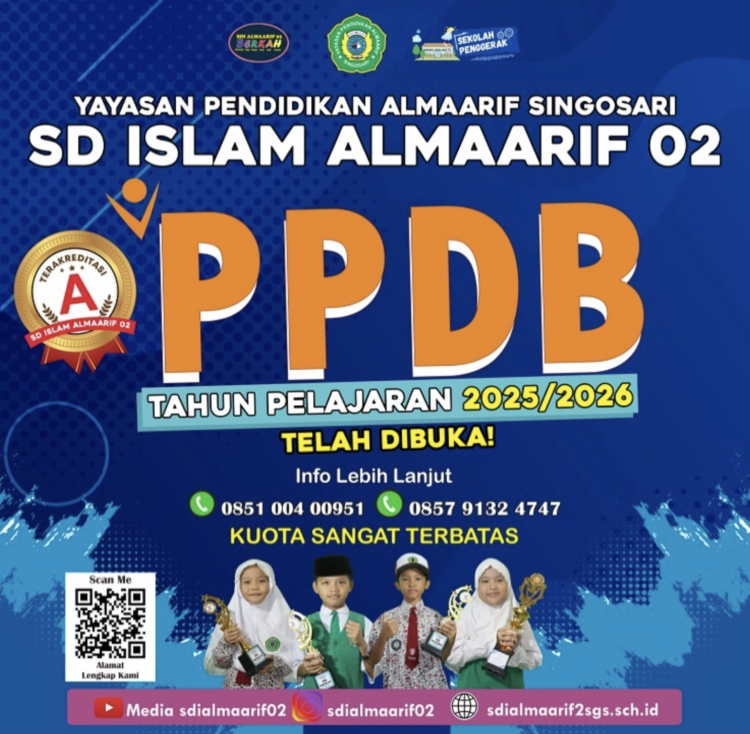 PPDB SD ISLAM ALMAARIF TAHUN PELAJARAN 2025/2026 sudah dibuka Kuota sangat terbatas Insyallah sudah terisi 75% mari bergabung menjadi keluarga SD ISLAM ALMAARIF 02 singosari